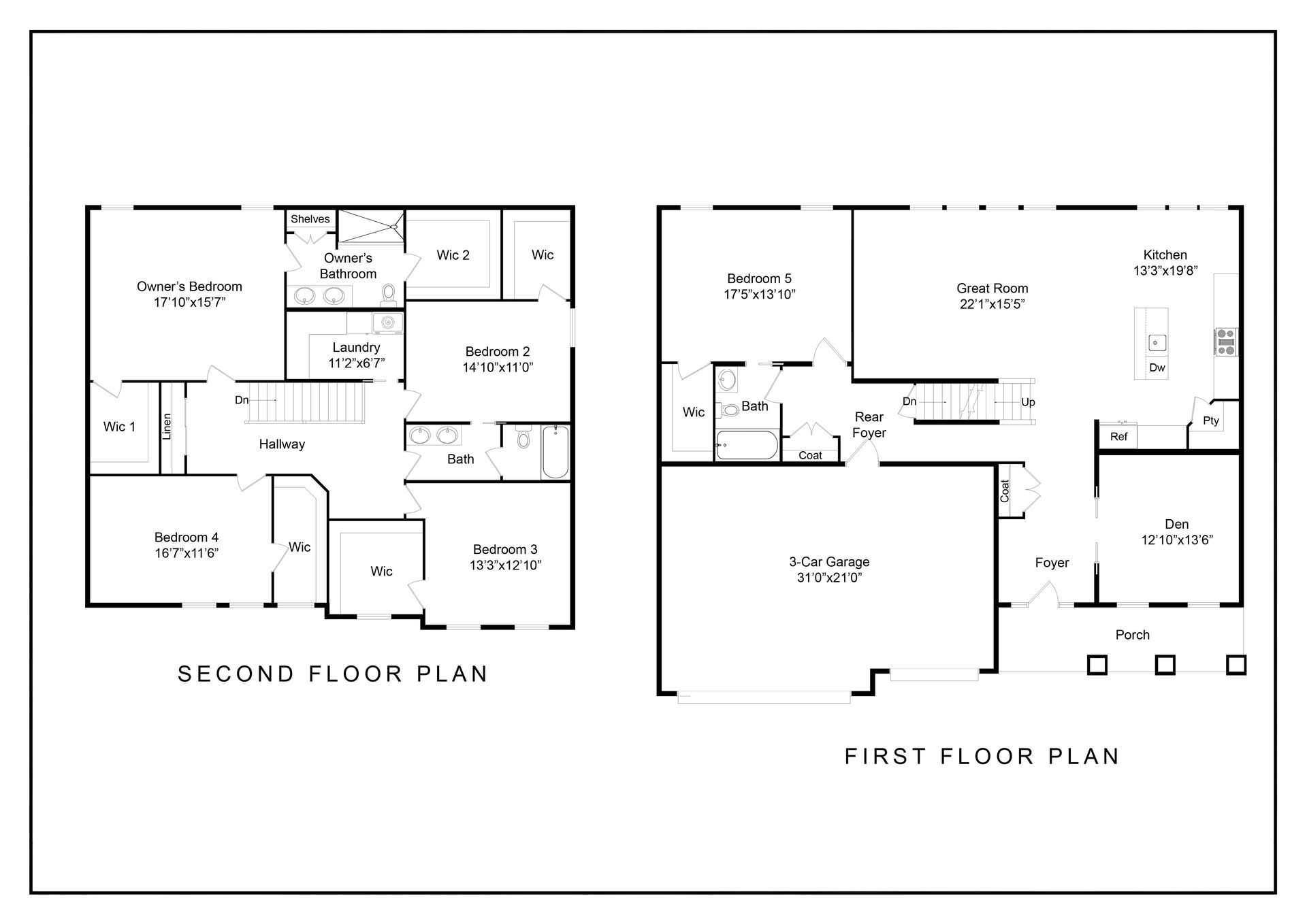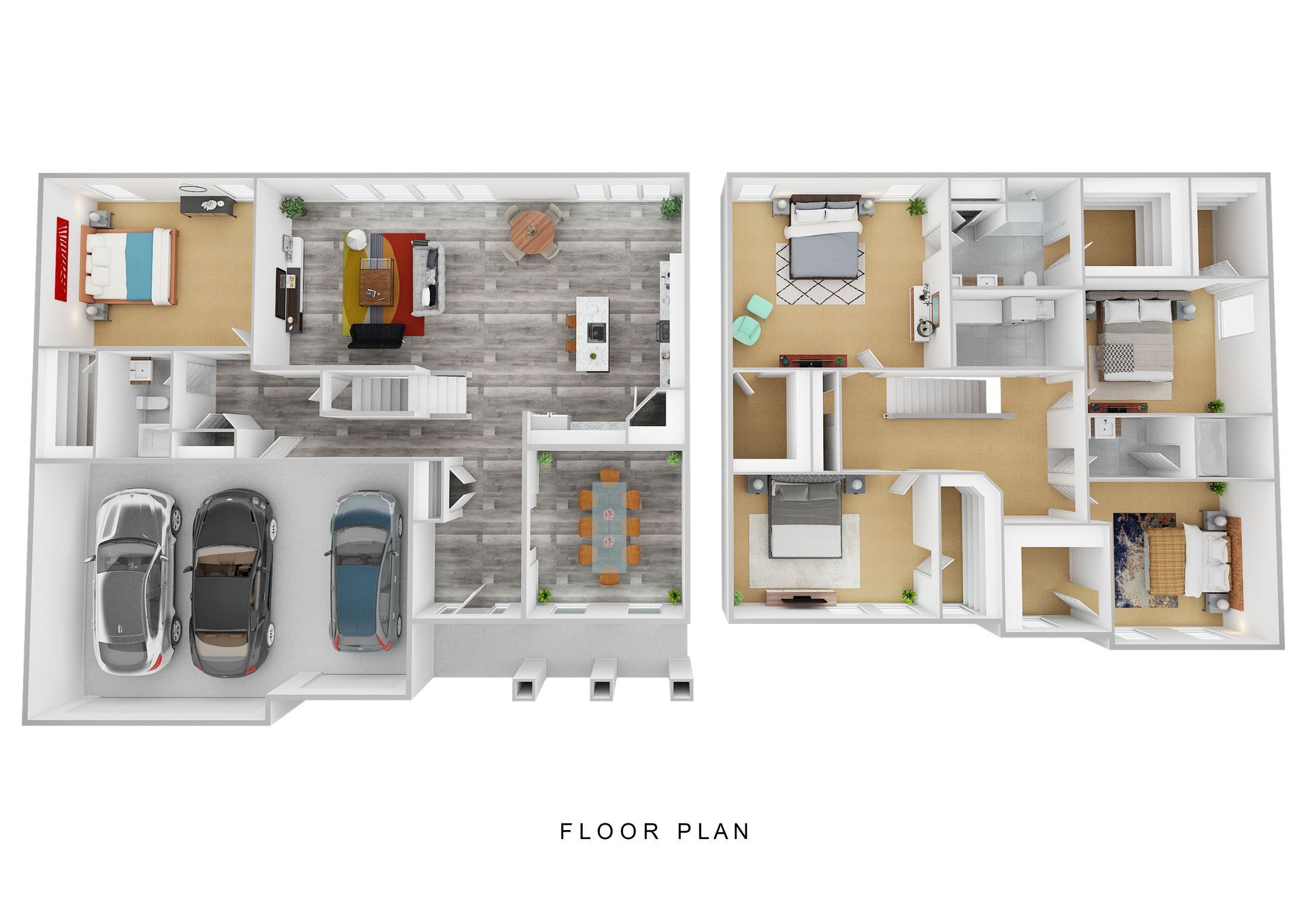 The Clarion floor plan is Faber Builders most spacious with 5 bedrooms, 3 baths, and 3,264 square feet of spacious living space. The open foyer sits next to a large flex room fitted for any need you may have. The space then opens to the great room, dinette, and kitchen. Moving down the hallway you will find the first bedroom with a walk-in closet and the first full bathroom across the way from the 3-car garage. Upstairs, the hallway is large enough to fit the final 4 bedrooms. The owner’s bedroom features a private bathroom and two walk-in closets. The second bedroom is located across the hall with a walk-in closet. On the opposite side sits the final two bedrooms, also equipped with walk-in closets. The final two rooms are joined by the final full bathroom that also leads back into the hallway.